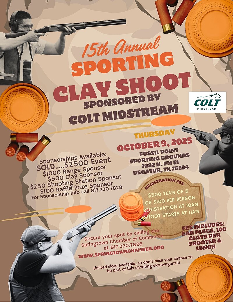 The Springtown Chamber is hosting a Sporting Clay Shoot in October. The Clay Shoot will take place at Fossil Pointe Sporting Grounds in Decatur, Texas. Registration includes earplugs, 100 shooting clays, and lunch. The three (3) highest individual scores and winning teams are presented with plaques.
